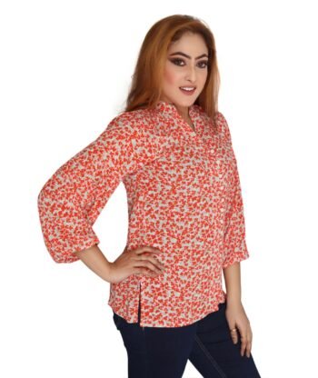 Women’s Red Floral Print Button-Up Blouse – Long Sleeve, Collared Shirt